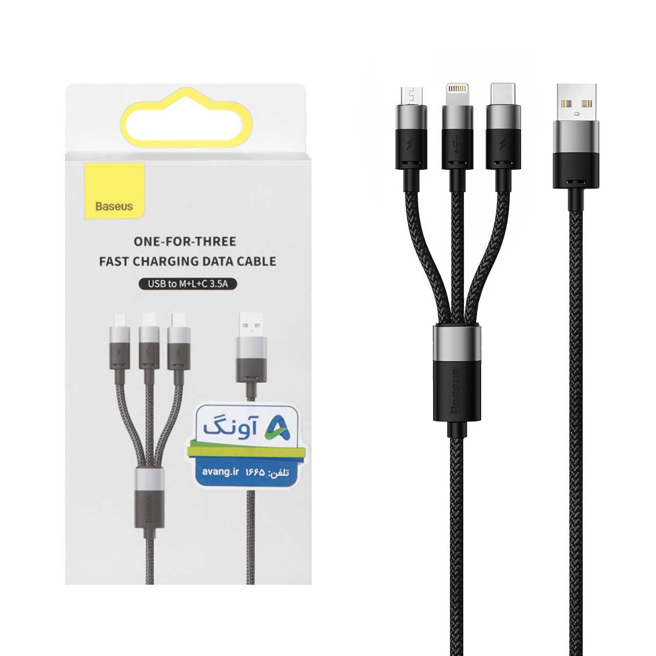 کابل شارژ فست سه کاره Baseus CB000030 با طول ۱.۲ متر و جریان خروجی ۳.۵ آمپر (حداکثر). دارای کانکتورهای Lightning، Micro USB و Type-C برای شارژ همزمان سه دستگاه. خرید از جانبی استور.