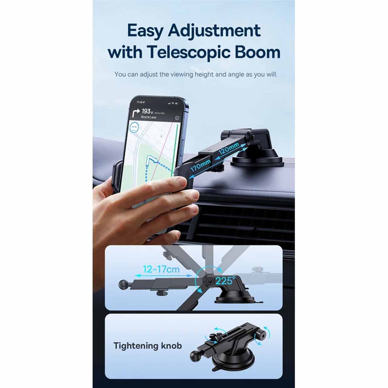 بازوی تلسکوپی: قابلیت تنظیم طول بازو (نزدیک و دور کردن گوشی) و همچنین تنظیم ارتفاع، به راننده اجازه میدهد بهترین زاویه دید ارگونومیک را بدون ایجاد مانع دید ایجاد کند.