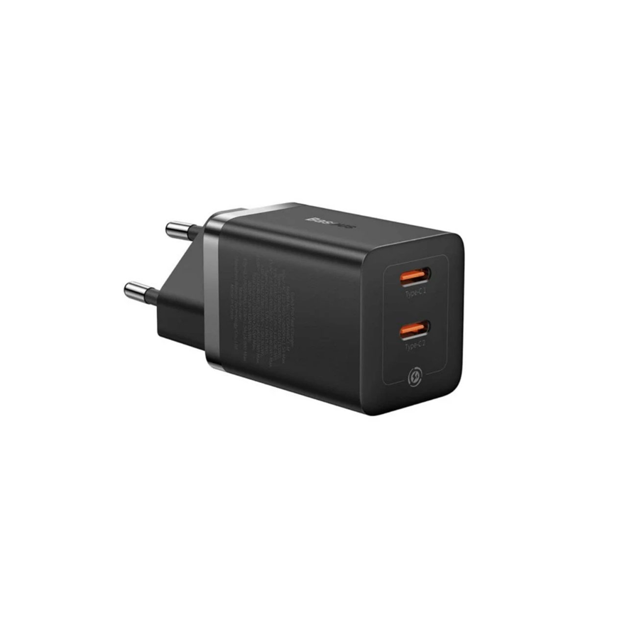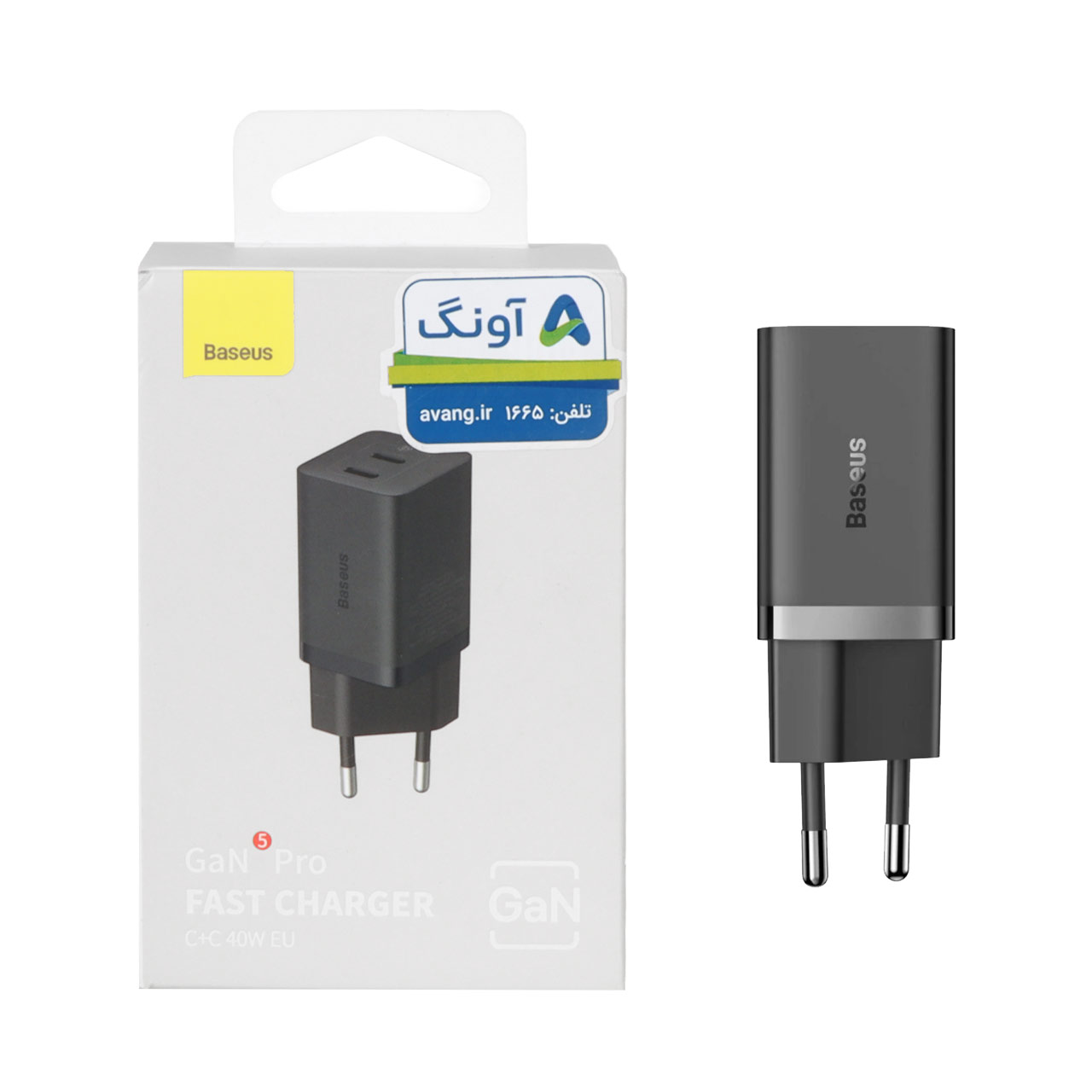 شارژر دیواری Baseus GaN5 Pro با توان ۴۰ وات و ۲ پورت Type-C (PD/QC). شارژ همزمان دو دستگاه با سرعت ۲۰W+۲۰W یا یک دستگاه با ۴۰W. کوچک، سبک و ایمن. خرید از جانبی استور.