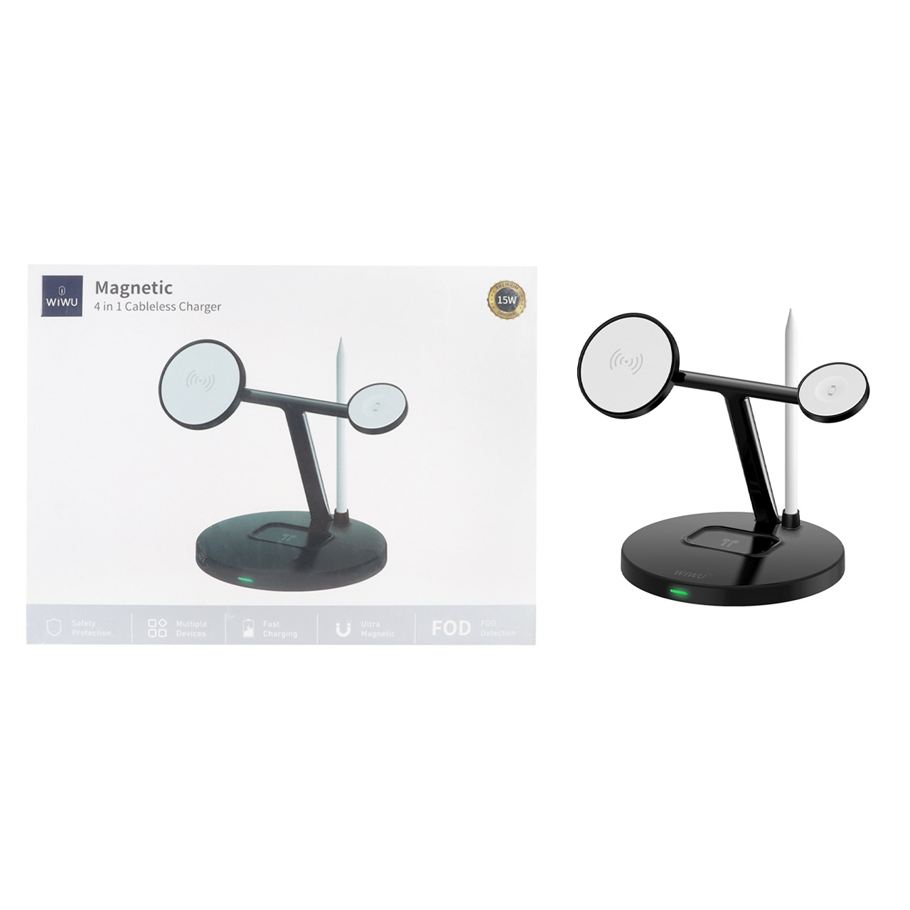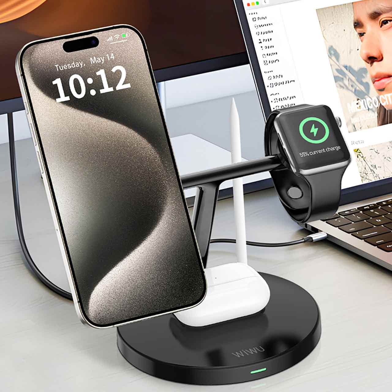 شارژر وایرلس چندکاره Wiwu مدل Wi-W032 یک ایستگاه شارژ رومیزی با طراحی شیک و کارآمد است که تمامی نیازهای شارژ بیسیم کاربران محصولات اپل و سایر دستگاههای سازگار با استاندارد Qi را در یک مکان پوشش میدهد. این محصول ۴ در ۱ با هدف کاهش آشفتگی کابلها و ارائهی یک راهکار تمیز و مدرن برای شارژ همزمان دستگاههای مختلف، طراحی شده است.